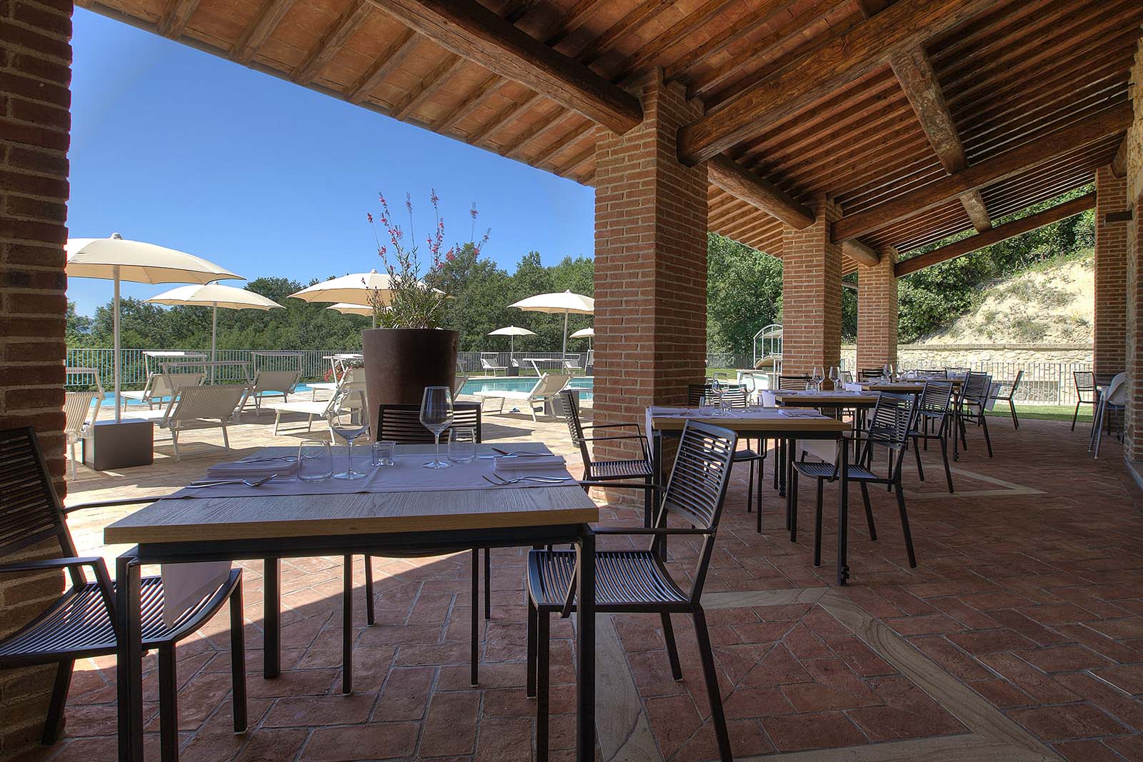 Ai tavoli a bordo piscina potrete rilassarvi al suono delle sue cascate, accompagnando le nostre proposte gourmet con i pregiati vini delle nostre colline.